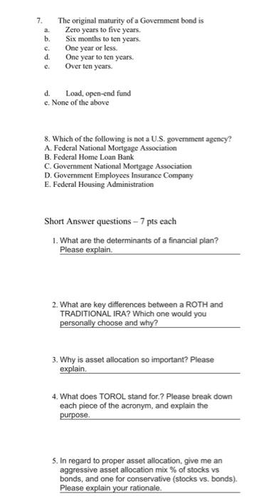 Solved 7 The Original Maturity Of A Government Bond Is A Chegg Com